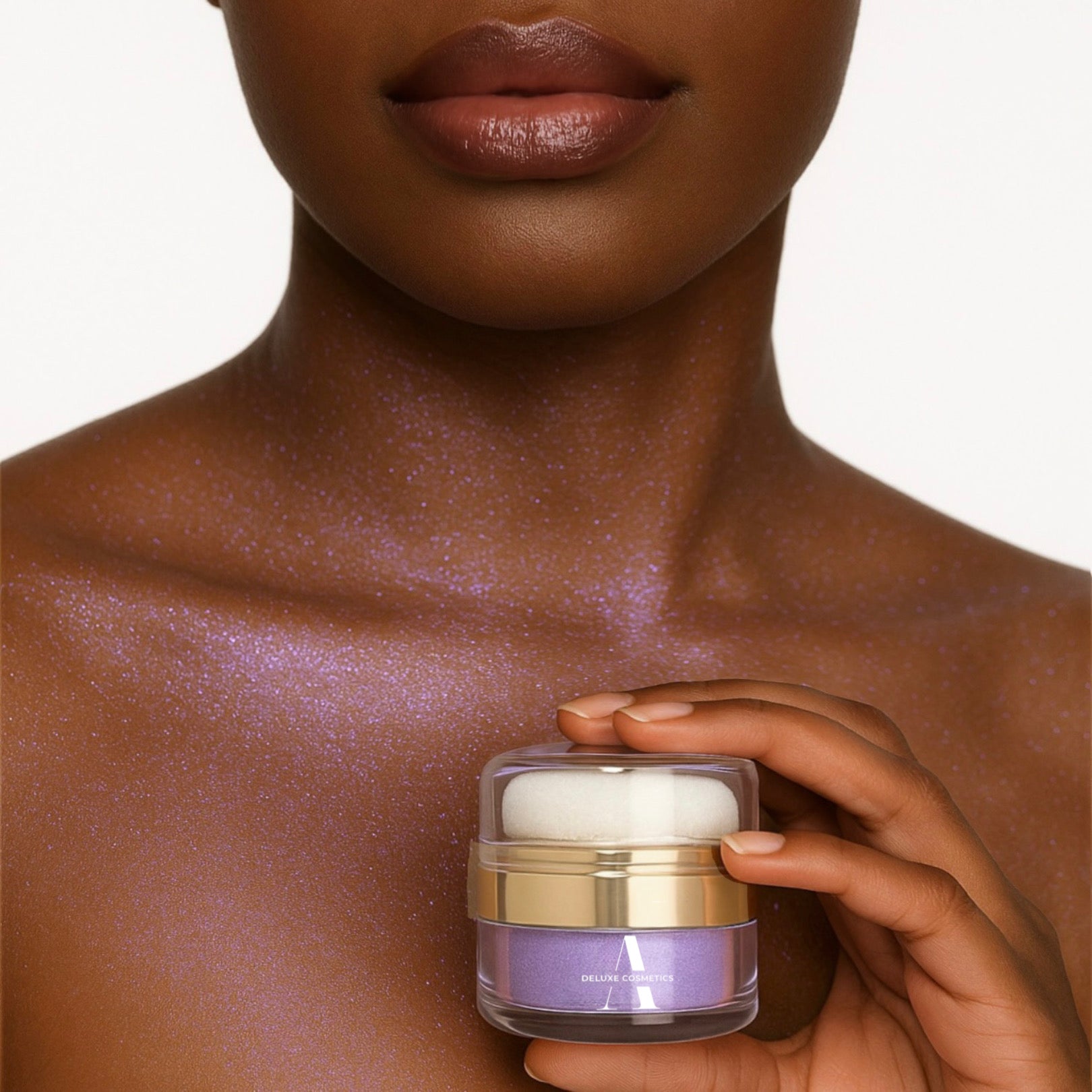Elevating Your Everyday Glow : Step into the spotlight with The Body Glitter Collection, where luxury meets radiance. Each velvet puff releases a soft cloud of ultra-fine glitter that settles effortlessly onto the skin, creating a refined, transfer-proof glow that lasts. Whether for a subtle highlight or a full-glam moment, this collection transforms every touch into a statement.